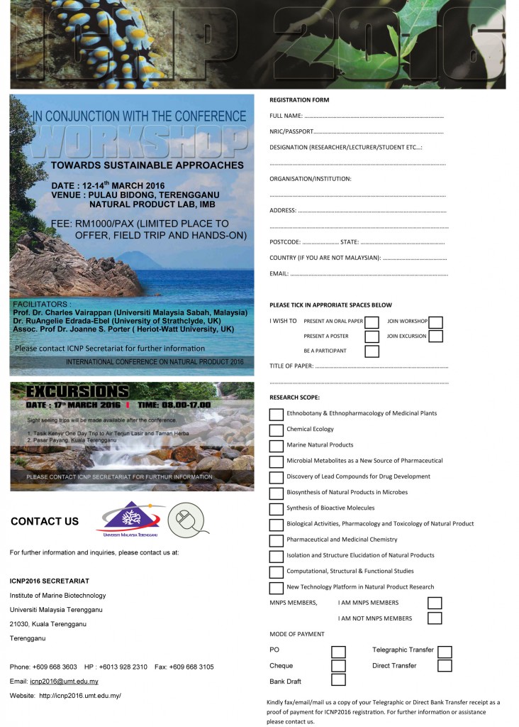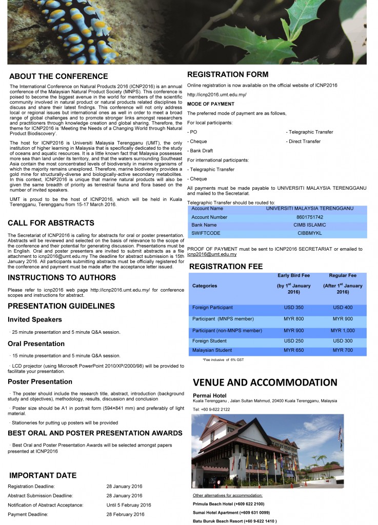 Title : International Conference on Natural Product 2016 (ICNP2016) Venue : Permai Hotel, Kuala TrengganuDate : 15th-17th March 2016Organiser: University Malaysia Trengganu (UMT)