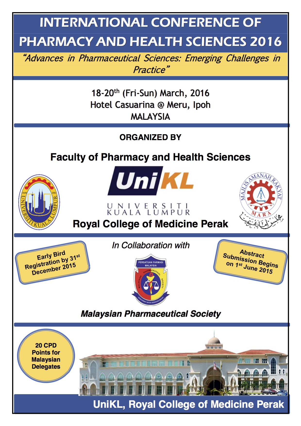 Title : International Conference of Pharmacy And Health Sciences 2016 ( ICPHS 2016) Venue : Hotel Casuarina, Ipoh Date : 18th- 20th March 2016 Organiser : University Kuala Lumpur (UniKL)